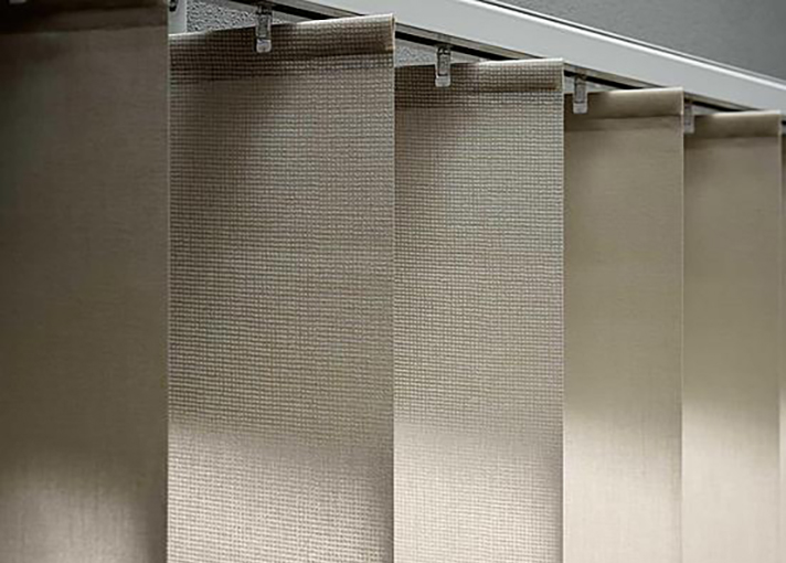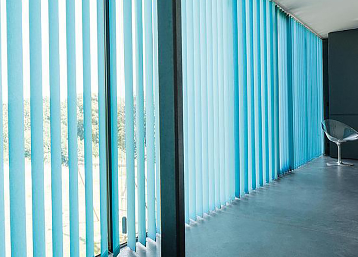 Eine Vertikal-Jalousie bezeichnet ein System aus miteinander verbundenen schmalen Stoffbahnen. Die vertikal angeordneten Lamellen lassen sich individuell und stufenlos einstellen oder wenden. Sie regulieren den Einfall von Tages- und Sonnenlicht.